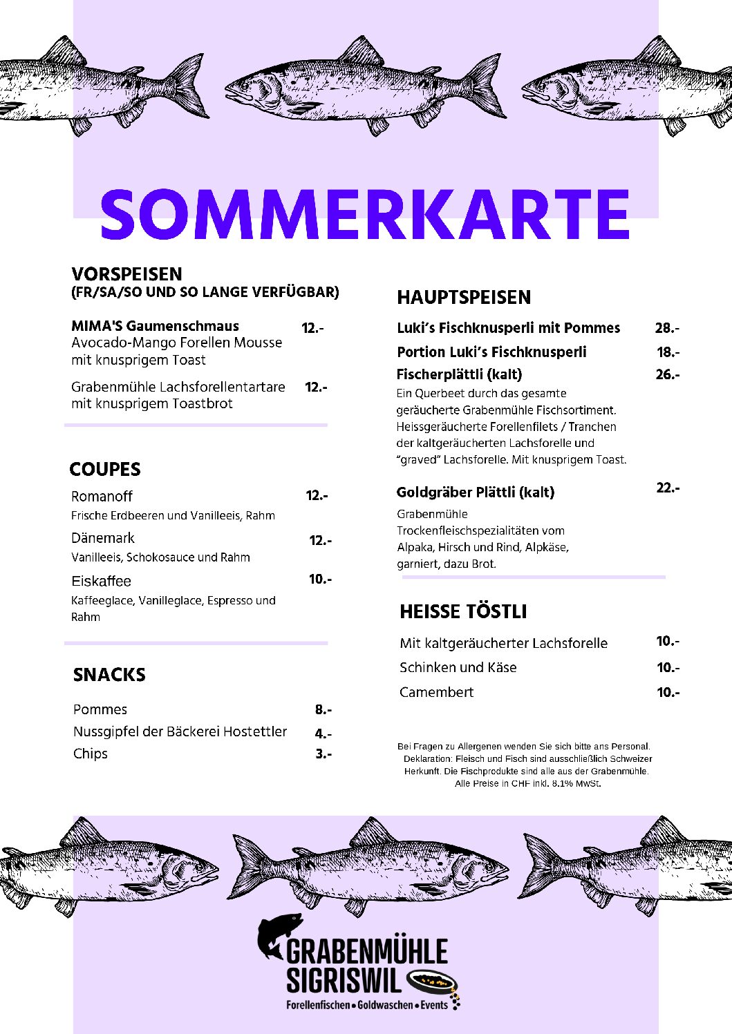 Geniessen Sie auf unserer sonnigen Terrasse oder in urchigem Ambiente geräucherte Spezialitäten, kalte Plättli mit Fisch oder Fleisch, dazu ein erfrischendes Getränk oder einfach unser Goldgräber-Kaffee.